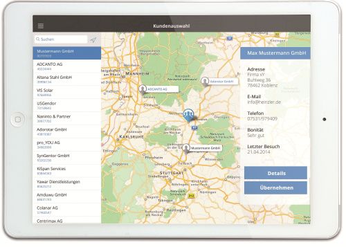 Die speziell auf die Anforderungen des Außendienstes abgestimmte Außendienst App „Vermo+“, die vom Heilbronner Spezialisten SIC! Software entwickelt wurde, ist für die Nutzung auf Tablets optimiert und wird permanent ausgebaut. Die komfortable, leistungsfähige und innovative Lösung für das iPad steht dem Außendienstmitarbeiter rund um die Uhr zur Verfügung. Zur Vorbereitung, Durchführung und Nachbereitung der Verkaufsgespräche benötigen die Mitarbeiter Kunden- und Produktdaten. Das iPad greift dabei auf Daten aus den Modulen Vertrieb und Call Center sowie auf die Katalogverwaltung zu. Zur optimalen Besuchsvorbereitung können Besuchspläne erstellt werden. Zusätzlich zeigt die Kundenliste eine Übersicht aller Kunden, für die der entsprechende Mitarbeiter zuständig ist. Diese Aufstellung wird ergänzt durch eine Kartenansicht, die die geographische Position der Kunden mit Pins zeigt.