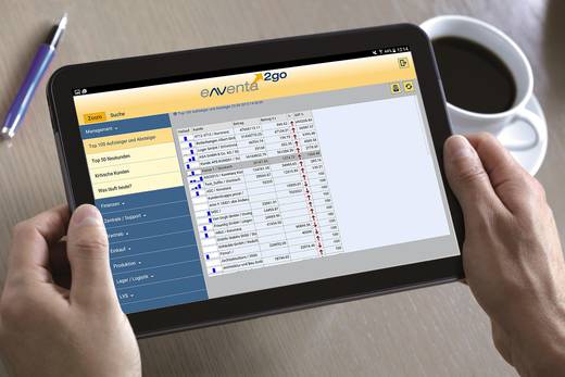 eNVenta2go enthält alle Funktionen von eNVenta Zoom, das individuell ausgewählte Kennzahlen und Informationen in einem Cockpit anzeigt. Selbstorganisation, Controlling und Kennzahlen sowie Monitoring sind die Anwendungsfelder, welche eNVenta Zoom abdeckt. Die App bringt alle Zoom-Elemente auf Ihr Smartphone oder Ihr Tablet, so dass auch unterwegs die gewohnten persönlichen Informationen und Kennzahlen zur Verfügung stehen. Die übersichtliche Darstellung Ihrer ausgewählten Informationselemente garantiert, dass Sie jederzeit und überall über einzelne Vorgänge oder die aktuelle Unternehmenssituation im Bild sind. So können Sie schnell eingreifen oder gegensteuern - eine große Hilfe, um die Herausforderungen der täglichen Arbeit erfolgreich zu meistern. Damit ist die App ein kleiner Helfer, der den modernen Arbeitsplatz außerhalb des Schreibtischs im Büro sinnvoll ergänzt. Außerdem haben Sie die Möglichkeit, sich dynamische Reports auf dem Mobilgerät anzeigen zu lassen und per Mausklick bis auf die Detailebene zu analysieren. Alle wesentlichen Informationen aus eNVenta wie Aufträge, Bestellungen, Wareneingänge, Artikel und Kunden können mobil recherchiert und dargestellt werden.